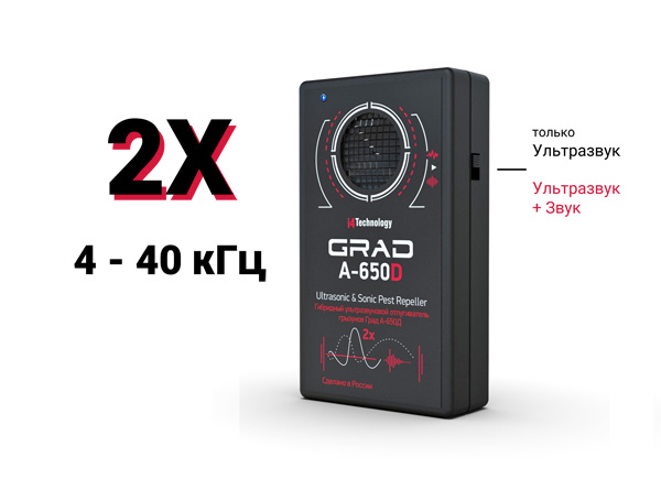 - Два режима работы: АБСОЛЮТНО бесшумная работа или режим звук + ультразвук (мощность в 2 раза выше!). В отличие от модели "ГРАД А-550", данный прибор может работать в слышимом диапазоне, что в два раза повышает эффективность отпугивания. Режим 2х кратной мощности удобно использовать в нежилых помещениях, на складах, в хозяйственных постройках, заставленных коробками и т.п. В этом режиме излучение фактически "проникает сквозь стены", что позволяет бороться с вредителями в сложных условиях, где мешают различные препятствия, предметы, вещи и т.п. Выгоняет даже крыс и мышей, живущих в соседних помещениях и внутри стен!